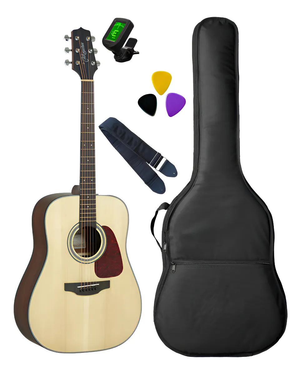 O instrumento é construído com Tampo em Spruce Laminado, que proporciona um som brilhante e com ótima projeção, e Laterais/Fundo em Mogno Laminado, que adiciona profundidade e calor ao timbre. O braço em Mogno e a escala/cavalete em Ovangkol (madeira similar ao Rosewood) garantem estabilidade e tocabilidade confortável em suas 20 casas. Por ser um modelo acústico, ele foca integralmente na ressonância e na qualidade do som natural do instrumento, sendo perfeito para estudo, composições e apresentações onde o microfone é a principal fonte de captação. É uma ótima opção de entrada na linha G da Takamine, e acompanha um conjunto de acessórios valiosos.
